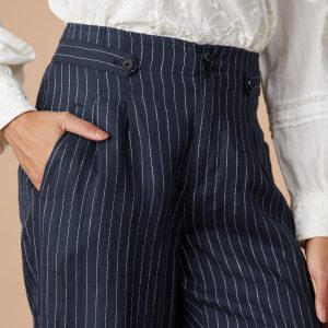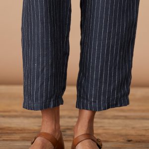 Menswear inspired with a feminine twist. our stylish four pocket pants with pinstripes have a comfortable tapered leg. classic waistband tab details and a sophisticated double button closure with zip fly. Linen. Machine wash. Imported. Exclusive. Sizes 2-16. 27 inseam.