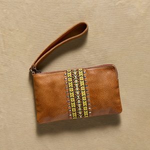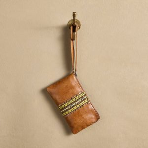 Handcrafted in small batches by skilled craftspeople. the Chamiso Zippered Pouch is made of full-grain leather embellished with embroidered ribbon. Chic and compact. with a wristlet strap. it carries your phone. cards and cash in style. Zip top. one interior pocket and four card slots. Imported. Approx. 8l x .5d x 4.5h.