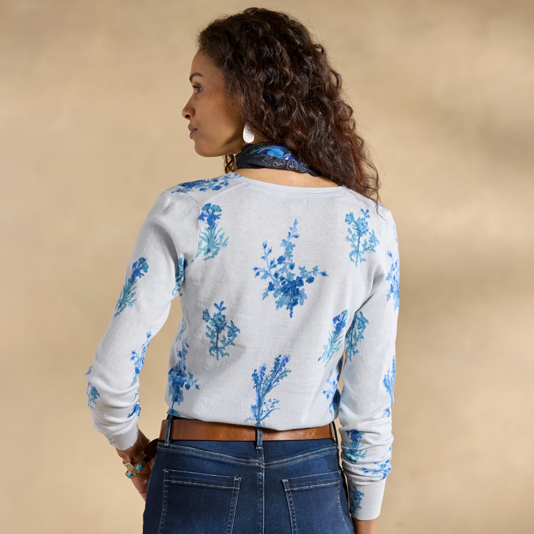 A woven garden party. the Larkspur Cardigan features a flattering fitted shape in a featherweight knit festooned with a feminine floral print. Cotton/linen. Hand Wash. Imported. Exclusive. Sizes XS (0–2). S (4–6). M (8–10). L (12–14). XL (16–18). XXL (20–22). Approx. 22l.