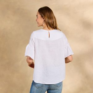 You’ll feel free in our flowing and relaxed top with elegant flutter sleeves and shirring at the neckline. Keyhole at the back with button closure. Linen. Hand wash. Imported. Exclusive. Sizes XS (0?C2). S (4?C6). M (8?C10). L (12?C14). XL (16?C18). XXL (20?C22). Approx. 25l.