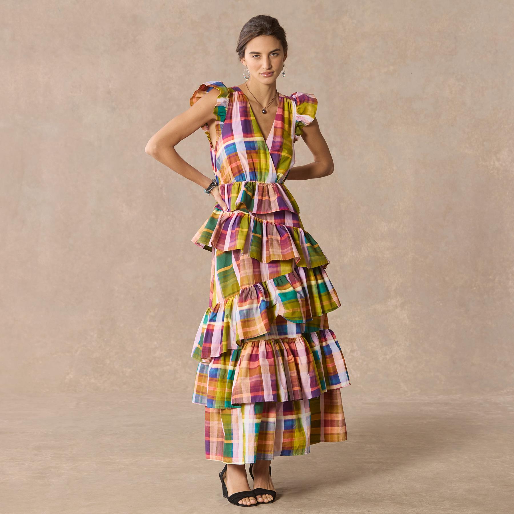 A bold madras plaid and asymmetrical. ruffled tiers make for a real statement piece. Ruffled cap sleeve. back tie at neck. Cotton. Dry clean. Imported. Sizes 2?C16. Approx. 55l.