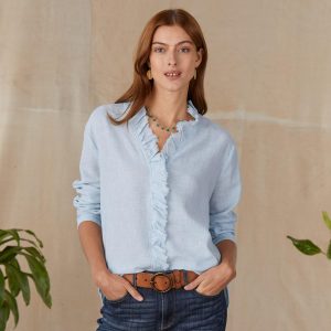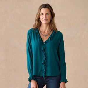 This classic. button-up blouse has timeless style and a fresh. feminine twist with ruffle details at neckline and cuffs. Beautifully draping. with back pleat and slight shirttail hem. Rayon. Machine wash. Imported. Sundance exclusive. Sizes XS (4). S (6). M (8–10). L (12). XL (14). XXL (16). Approx. 25.5l.