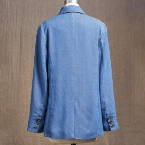 A feminine take on a menswear inspired style. this stunning blazer is double breasted in denim with faux horn buttons. welt pockets with flaps and a notch lapel. Fully lined in lovely florals at the body and classic stripes in the sleeves. Center vent. Lyocell. Machine wash. Imported. Exclusive. Sizes XS (0-2). S (4-6). M (8-10). L (12-14). XL (16-18). XXL (20-22). Approx. 29.75l.