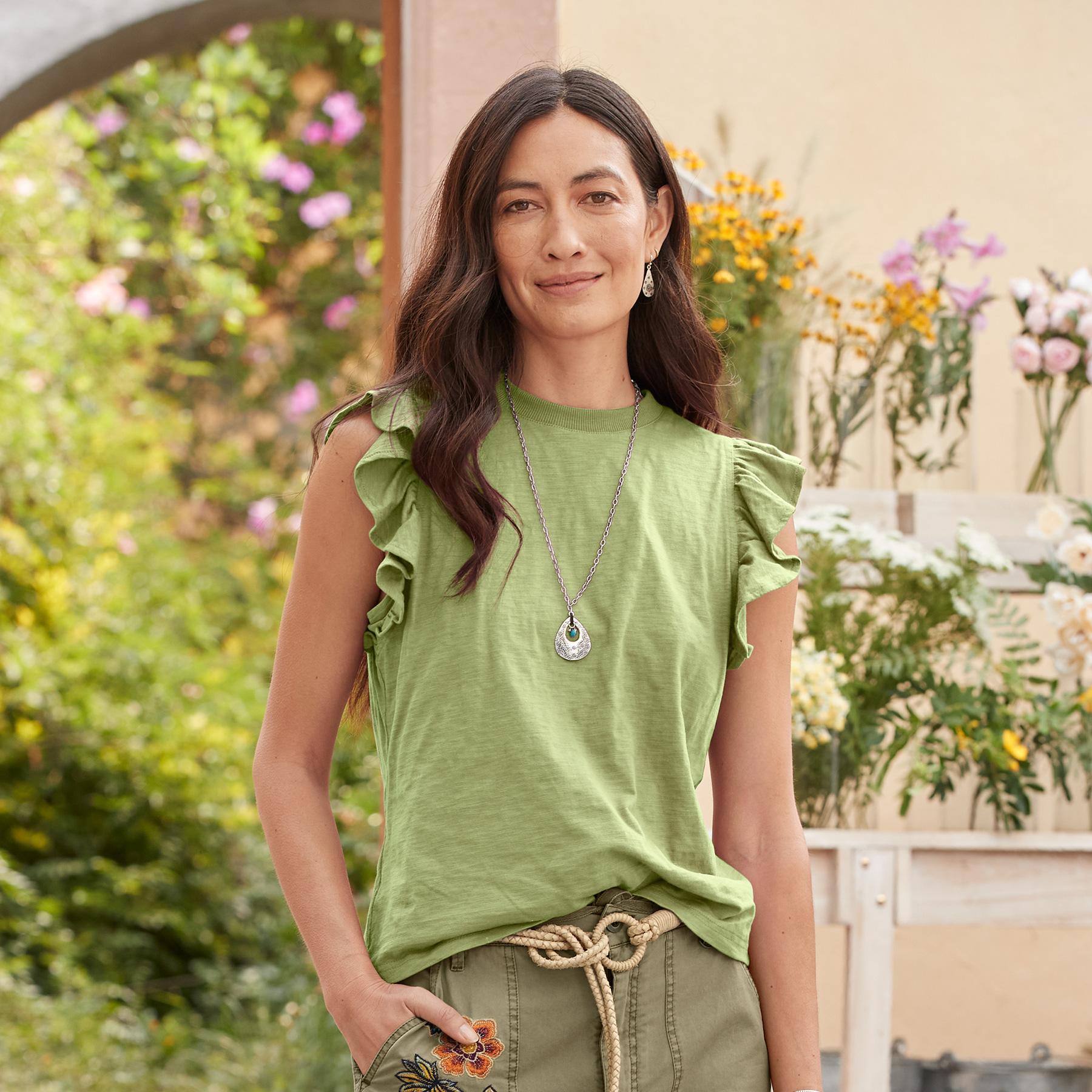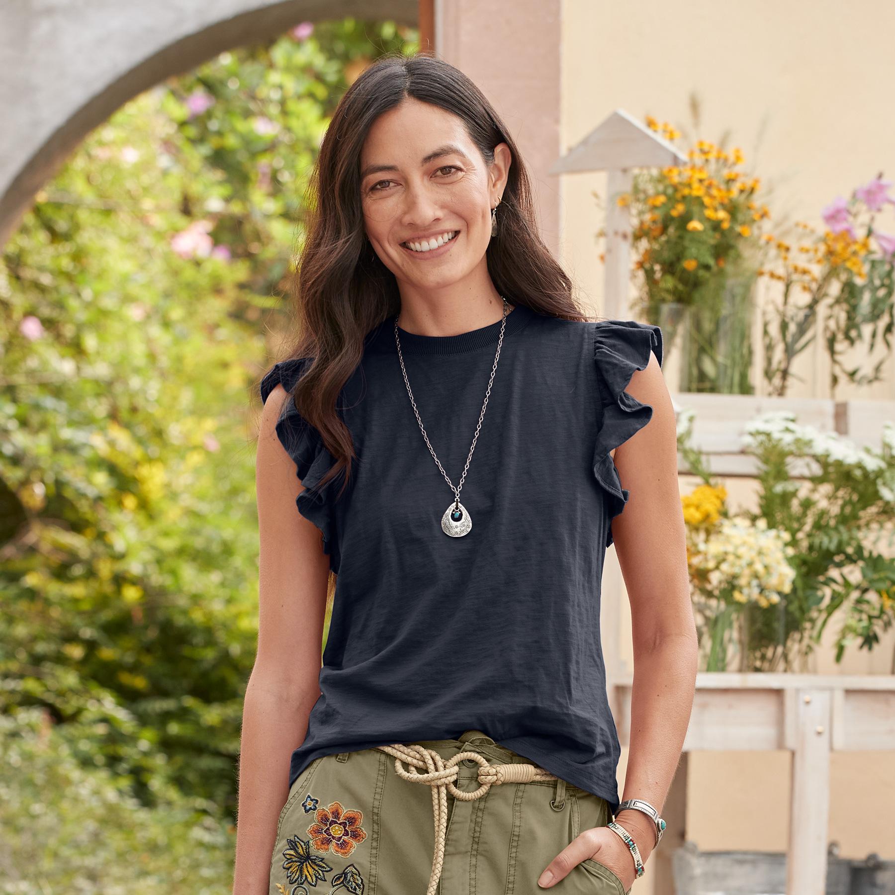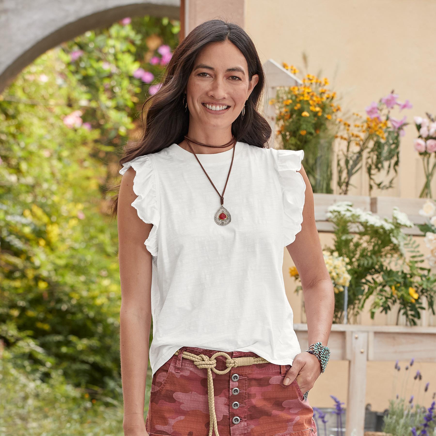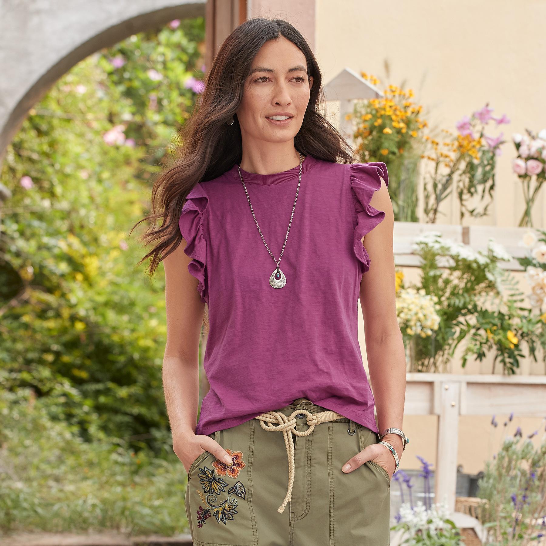 Add a casual touch of refinement to your outfit with this soft. flutter sleeve tee. Cotton. Hand wash. Imported. Exclusive. Sizes XS (0 to 2). S (4 to 6). M (8 to 10). L (12 to 14). XL (16 to 18). Approx. 24-1/4L.
